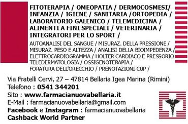 Per la tua salute, puoi sempre fare riferimento alla Farmacia Nuova Bellaria: l’attenzione verso una molteplicità di esigenze, unita alla cordialità e alla preparazione del nostro staff, ti assicura l’accesso al trattamento più adeguato alle tue esigenze. Vieni a trovarci a Bellaria Igea Marina in via Fratelli Cervi, 27 da lunedì a sabato dalle 08:00 alle 13:00 e dalle 15:30 alle 19:30 e accettiamo contanti, carte e bancomat. Per richiedere informazioni e restare aggiornato, telefonaci allo 0541 344201!